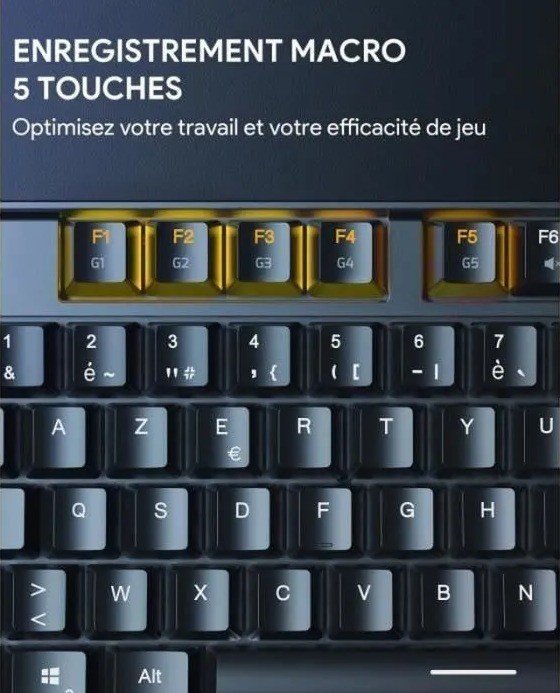 Profitez d’une expérience de jeu professionnelle avec le clavier mécanique AUKEY KM-G16. Équipé de switchs Blue pour une frappe rapide et un clic agréable, avec rétro-éclairage RGB LED personnalisable. Comprend 104 touches complètes et la fonction Anti-Ghosting permettant d’appuyer sur plusieurs touches simultanément sans perte de commande, idéal pour le gaming compétitif. Design ergonomique et pratique, compatible avec Windows / PC / Laptop, connexion USB Plug & Play. Contenu du colis : 1 × Clavier mécanique AUKEY KM-G16 1 × Manuel d’utilisation Caractéristiques du produit Marque : AUKEY Modèle : KM-G16 Type : Clavier mécanique Gaming Disposition : AZERTY Français…