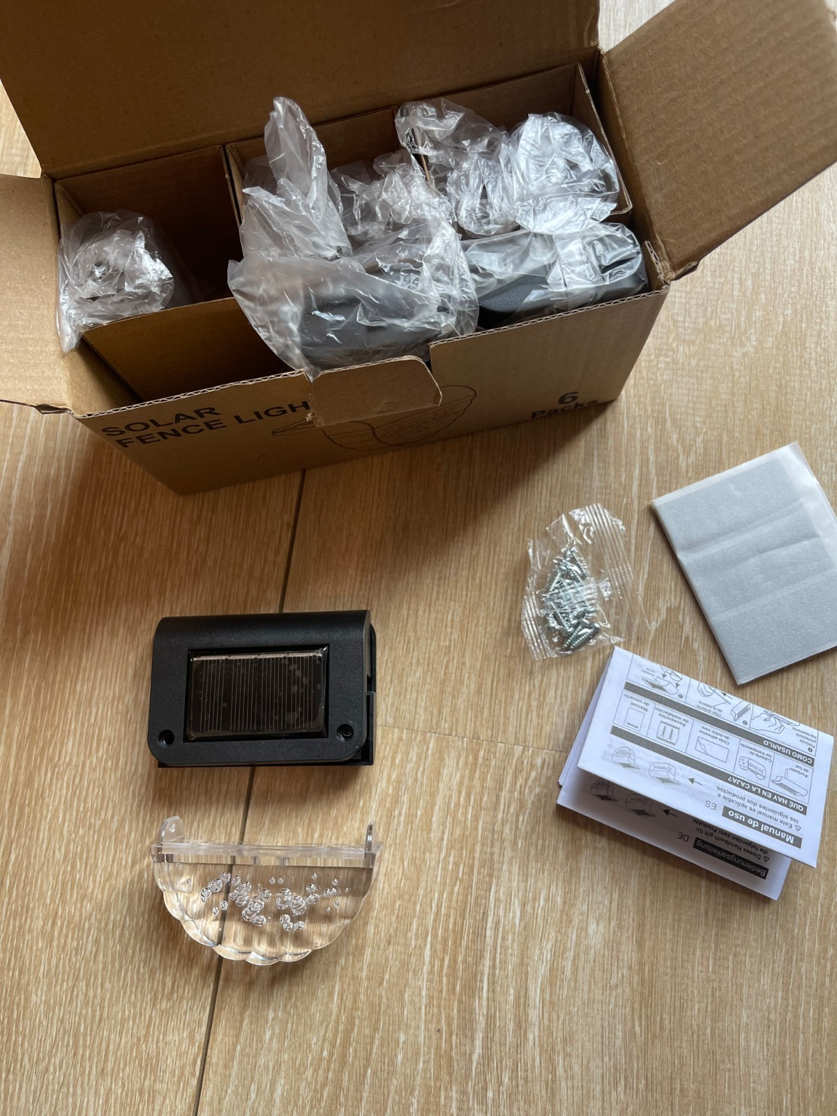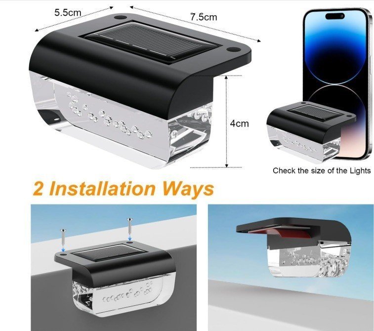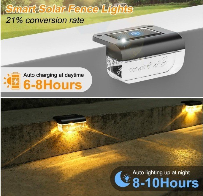 Ce lot de 6 lampes solaires LED pour extérieur est conçu pour offrir un éclairage autonome, durable et éco‑responsable. Chaque lampe est équipée d’un panneau solaire haute efficacité et de LED basse consommation, assurant une lumière douce et confortable sans besoin de câblage électrique. Placer ce lot de 6 lampes solaires dans un endroit ensoleillé et vous pourrez profiter d’un éclairage automatique à la tombée de la nuit jusqu’à l’aube.   Cet ensemble de lumière de clôture solaire vous assure une décoration parfaite pour vos extérieurs , tels  les terrasses, les allées du jardin , marches , poteaux de clôture…